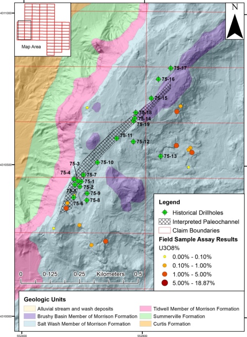 Uranium mineralization within the project is primarily situated in the Salt Wash Member of the Jurassic Morrison Formation. The Tidwell Mineral Belt in the San Rafael Uranium District hosts the mineralization, which is organized in a series of northeast-oriented trends. The individual mineralized bodies exhibit a tabular to lenticular morphology, aligning their long axis along the identified trend.